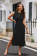 This knit midi dress blends casual comfort with effortless style. Featuring a round neckline, sleeveless cut, and side slit, it’s finished with a tie belt to flatter your figure. Pair it with sandals for daytime or boots and a jacket for a chic layered look.